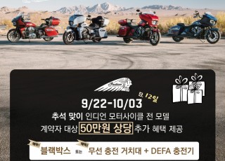 추석 전, 바이크 바로 받자! 9/28까지 신규 계약시 연휴 전 특급 배송 혜택 추석 연휴 전까지 특급 배송 + 추석 연휴 특별 프로모션 | 최대 50만원 상당 혜택 제공 (블랙박스 or 핸드폰 무선 충전 거치대 + DEFA 바이크 충전기) 대상 모델(일부 선호 컬러 한정) 스카우트 바버…