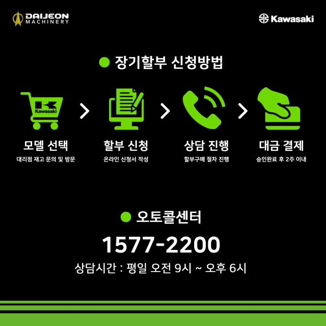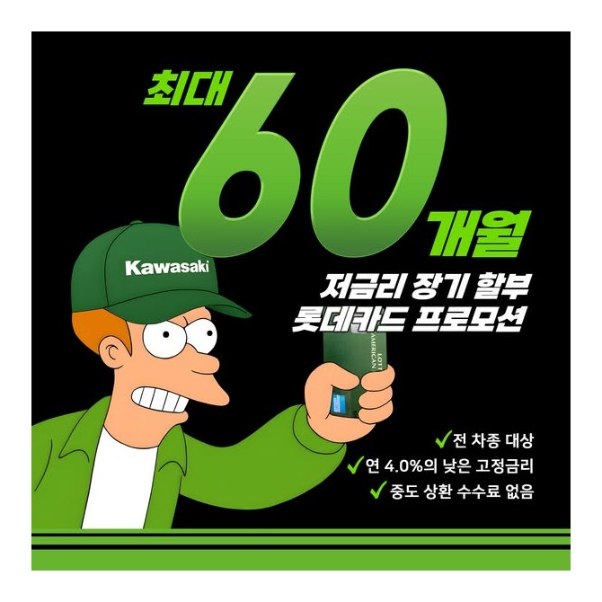 현재 판매 중인 가와사키 전 모델을 대상으로 최대 60개월 저금리 장기할부 프로모션 실시!