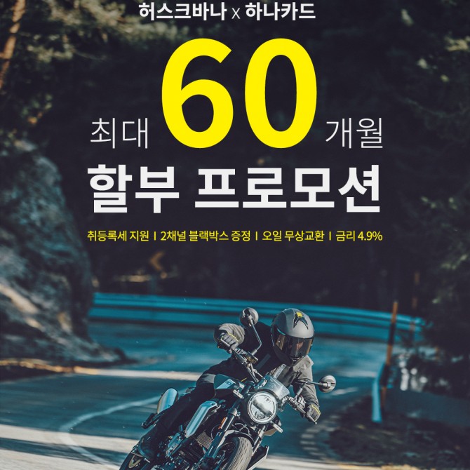 - 허스크바나 모터사이클 코리아가 하나카드와 함께 60개월 장기할부 프로모션을 진행합니다.