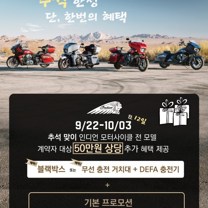 9/22–10/03 단 12일간 인디언 모터사이클 전 모델 계약 시, 기본 프로모션 + 50만원 상당 혜택
