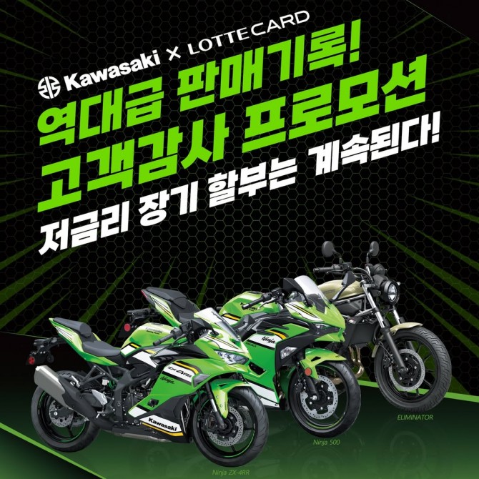 또한, 최대 60개월 장기할부는 연 4.0%의 저금리(해당 금리는 고객의 신용상태에 따라 변동 가능)로 엔트리 급을 포함한 가와사키의 전 모델을 롯데카드로 최대 60개월 장기할부로 구매할 수 있으며 Ninja ZX-4RR은 월 28만 원, Ninja 500과 엘리미네이터는 월 17만 원에 초기비용 부담 없이 오너가 될 수 있다.