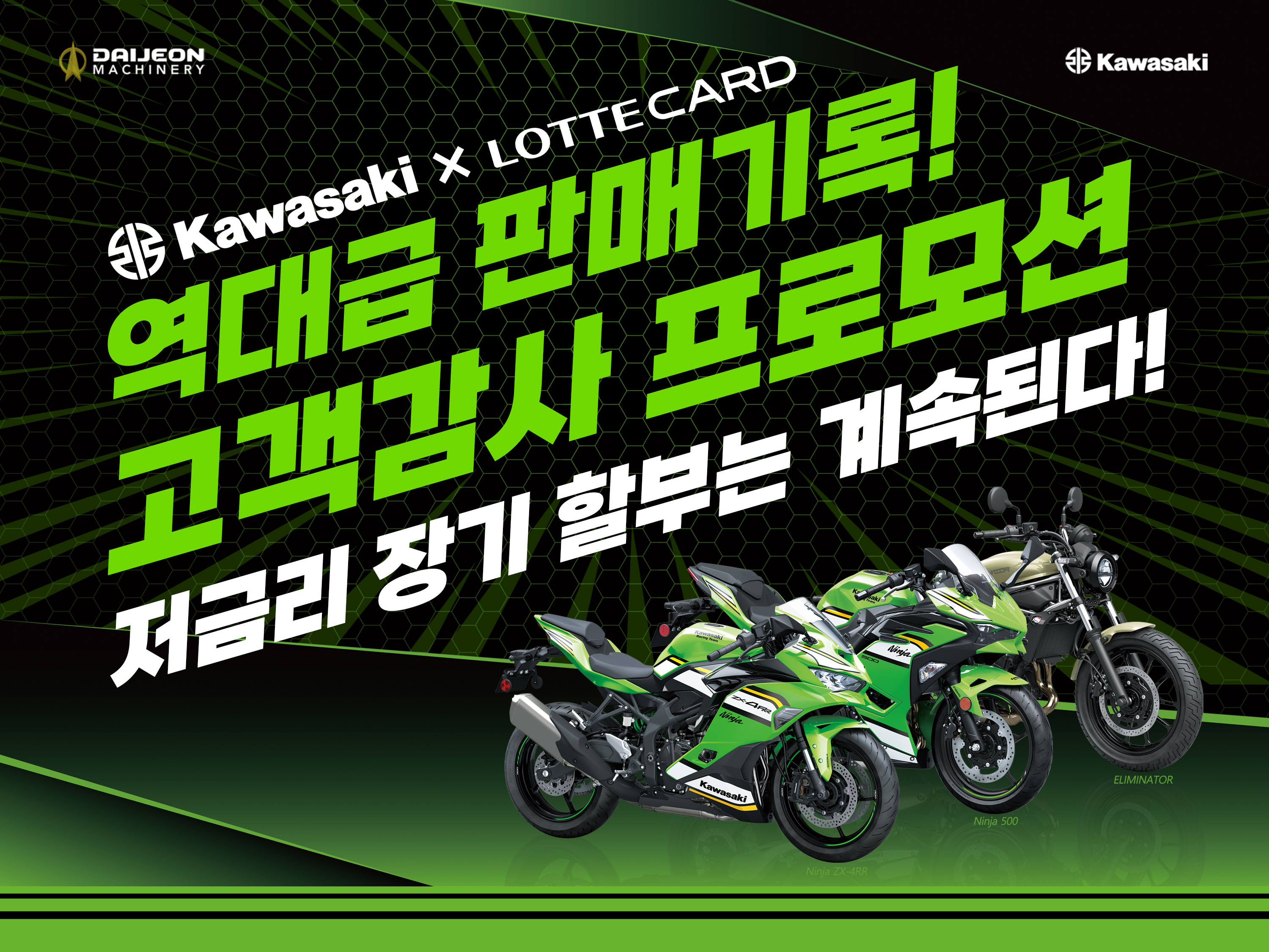 세 모델 모두, 롯데카드를 이용해 최대 36개월간 무이자로 가와사키 오너가 될 수 있다. 매달 나가는 이자 걱정 없이 온전히 라이딩의 즐거움만 누리면 된다.