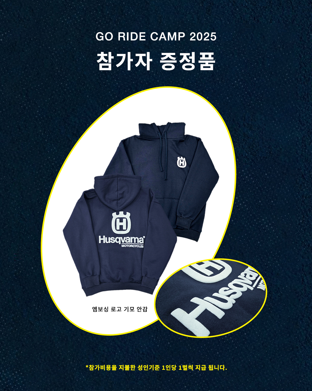 GO RIDE CAMP 2025에 참가하는 모든 라이더에게는 6만원 상당의 허스크바나 엠보싱 로고 기모 후드가 증정됩니다.