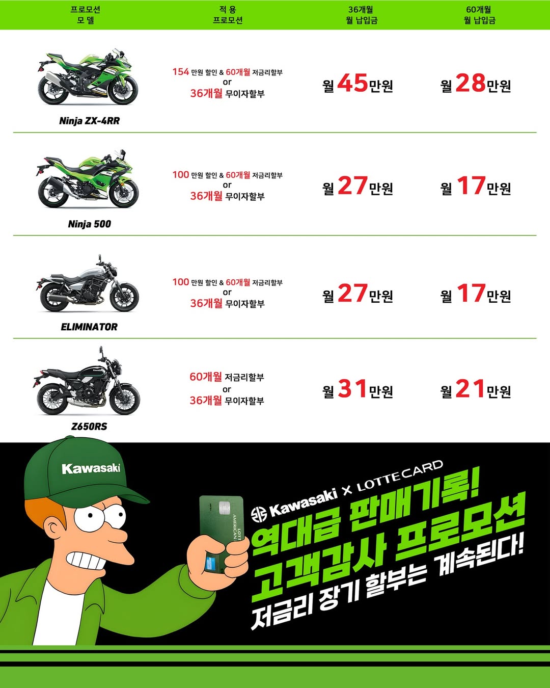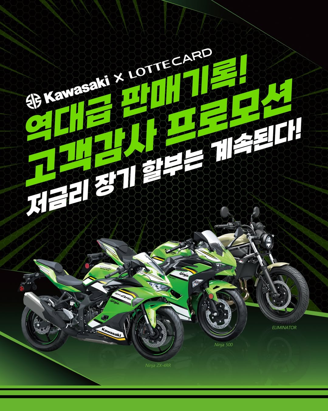 또한, 최대 60개월 장기할부는 연 4.0%의 저금리(해당 금리는 고객의 신용상태에 따라 변동 가능)로 엔트리 급을 포함한 가와사키의 전 모델을 롯데카드로 최대 60개월 장기할부로 구매할 수 있으며 Ninja ZX-4RR은 월 28만 원, Ninja 500과 엘리미네이터는 월 17만 원에 초기비용 부담 없이 오너가 될 수 있다.