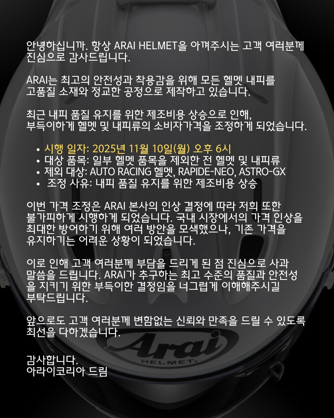 이로 인해 고객 여러분께 부담을 드리게 된 점 진심으로 사과 말씀을 드립니다. Arai가 추구하는 최고 수준의 품질과 안전성을 지키기 위한 부득이한 결정임을 너그럽게 이해해주시길 부탁드립니다.