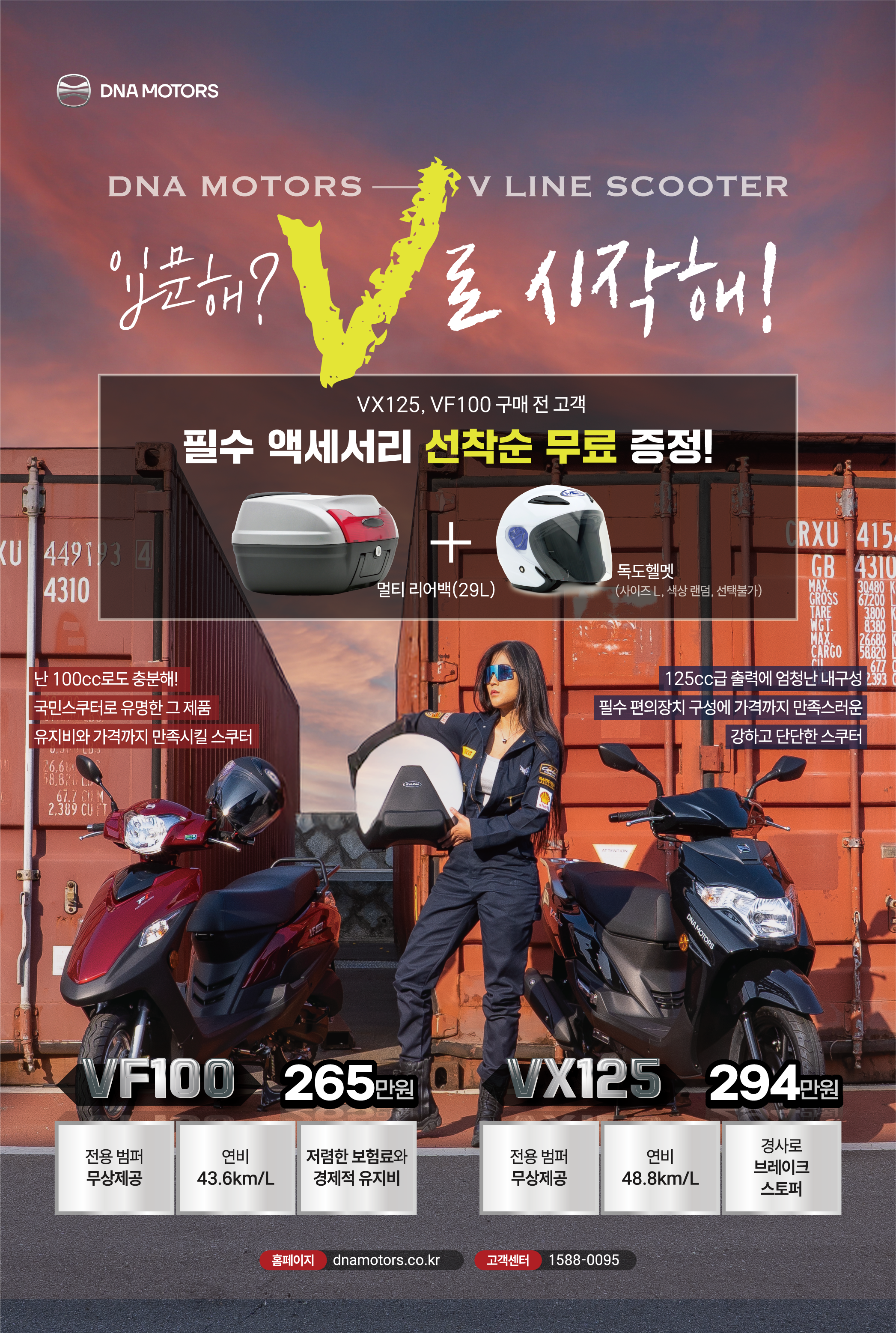 디앤에이모터스㈜가 11월 26일부터 입문자용 스쿠터 라인업 ‘V LINE’을 대상으로 ‘V라인 프로모션’을 진행한다. 이번 행사 기간 프로모션 대상 모델인 VX125와 VF100R 구매 고객에게 리어 멀티백(29L)과 오픈페이스 헬멧(독도헬멧·L사이즈)을 무상 제공한다.