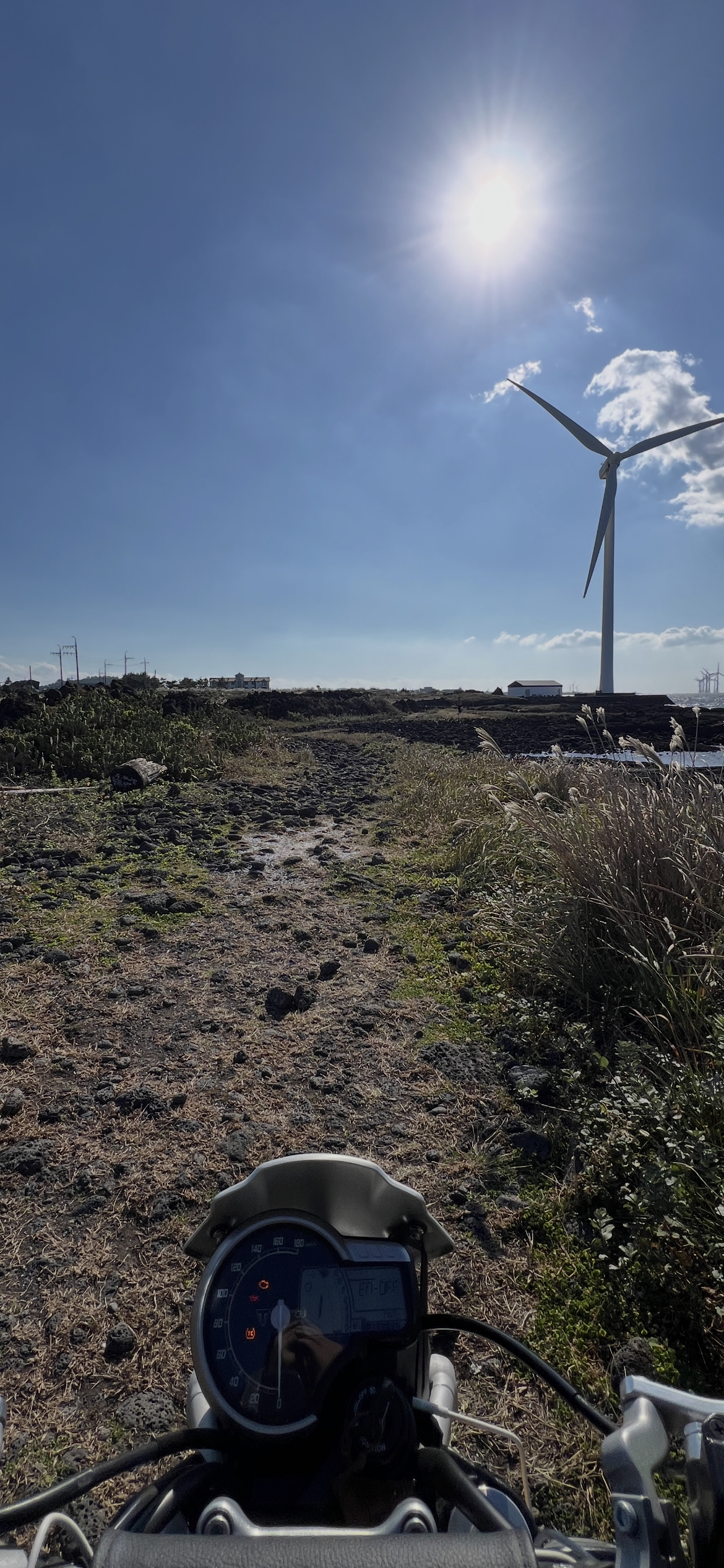 식사 후에 들른 첫 코스는 금능리의 해안가 비포장길이었는데 진입은 비단길이었지만 풍력발전기가 가까워지면서 점점 현무암 자갈의 크기가 커지더니 나중엔 도저히 내 실력으로는 주파가 어려운 수박사이즈 돌길이 나오길래 후퇴. 제주의 자갈길은 그 느낌이 매우 다르기에 좀 덜 험한 코스를 찾아보기로 하고 해안도로의 구석구석을 찾아 들어갔다. 400kg을 넘는 할리데이비슨 로드글라이드로는 절대 하지 않을 일이지만 스크램블러400X는 안되면 들고 나온다는 생각으로 포장, 비포장, 좁은 길을 가리지 않고 들이밀어 볼 만 했다.