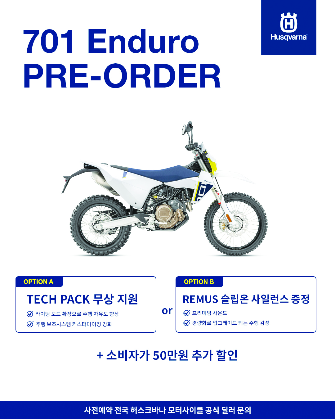 허스크바나 모터사이클 코리아는 MY26 701 Enduro 사전예약 고객을 위한 다양한 혜택도 함께 마련했다. 사전 예약 고객은 85만 원 상당의 테크팩 지원 또는 REMUS 슬립온 사일런스 증정 중 하나를 선택할 수 있다. 또한, 여기에 소비자가 기준 50만 원 할인 혜택이 추가로 제공된다.