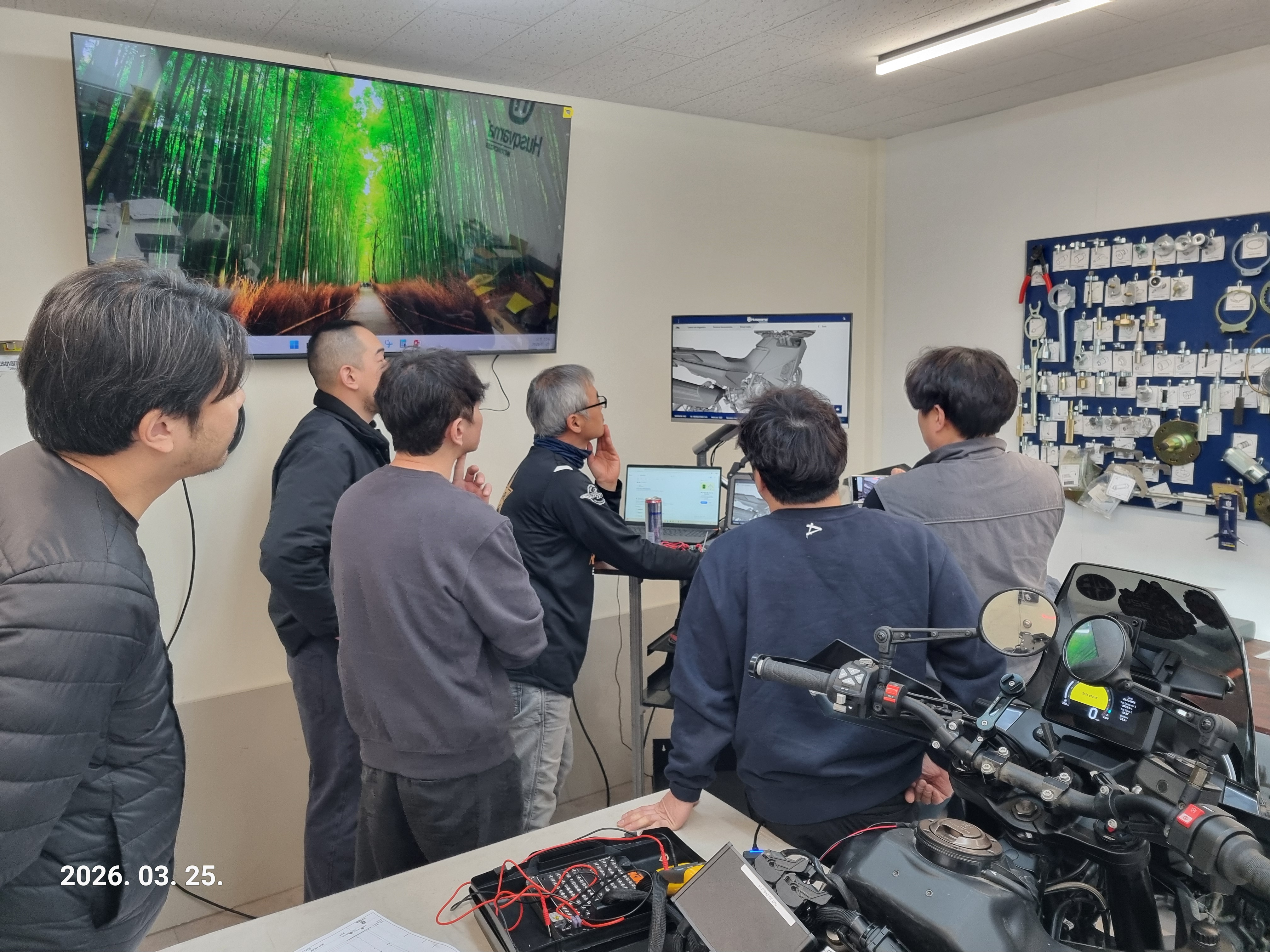 교육은 허스크바나 모터사이클 코리아 본사에서 이론과 실습을 병행하는 방식으로 진행되었으며, 실무 중심의 커리큘럼으로 구성됐다. 주요 교육 내용으로는 차량 회로도 분석 및 독해, 브레이크아웃 박스 활용 방법 등이 포함되었으며, LC8c 엔진 기반 실습 차량을 통해 실제 정비 환경과 동일한 조건에서 시연과 교육이 이루어졌다. 또한, XC3 진단기를 활용한 정밀 진단 기술과 다양한 기능에 대한 심층적인 교육이 함께 진행되어, 참가자들은 최신 진단 장비를 활용한 고도화된 정비 프로세스를 체계적으로 습득할 수 있었다.