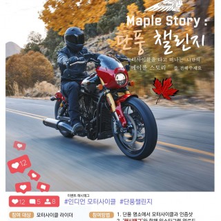 Maple Story 인디언 단풍 챌린지 단풍 “한 잎” 말고, 프레임 가득 단풍 속에 바이크가 파묻힌 사진을 올려주세요. Best 3를 선정해 배달의 민족 3만원 상품권을 드립니다. (전 기종 라이더 참여 가능) 참여 방법 1️⃣ @indianmotorcyclekorea 팔로우 2️⃣ 단풍 명소 + 바이크 사진/릴스 업로드 3️⃣ 게시…