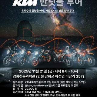 제2회 KTM 반딧불 투어 오픈 안내 지난 1회 행사에서 뜨거운 관심을 보내주셨던 KTM 반딧불 투어가 돌아왔습니다. 2025년 11월 21일(금) 저녁 8시 강화천문과학관(인천 강화군 하점면 이강리 357) 참가비 : 2만원 이번에는 밤하늘 아래에서 즐기는 투어 + 별 관측 + KTM 저지, 굿즈 + 프로필 촬영(후원:@peakdesi…