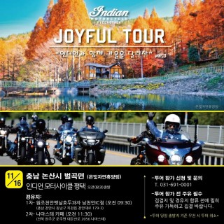 인디언 모터사이클 평택이 고객과 함께 동행하며 진행하는 "조이플 투어" 프로그램. ?2025 가을 단풍 투어 ver,3 11.16(일) 아름다운 충남 논산의 가을 단풍 길을 찾아 세 번째 이야기를 담으러 출발합니다. ?집결지: ✔️인디언 모터사이클 평택 전시장 ? (경기도 평택시 동막길 27) ?오전 08:30 ?경유지 1차: …
