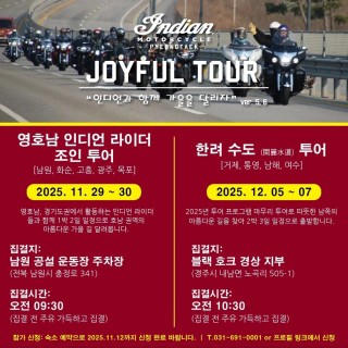 2025년 조이플 투어프로그램을 마무리하는 시즌 마지막 공식 투어를 따뜻한 남쪽에서 마무리 합니다. ?영호남 인디언 라이더 조인 투어? 경상권 인디언 부족들과의 연합 투어에 이어서 호남권역에서 활동하는 인디언 부족들과 호남 지역의 아름다운 가을 길을 인디언 부족들이 다시 한 번 달려봅니다. 이번 투어는 특별히 경기권역, 영남권역, 호남권역의 많…