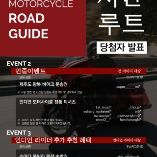 안녕하세요. 인디언 모터사이클 코리아입니다. 지난 11월부터 진행된 로드 가이드 – 서산편이 라이더 여러분의 뜨거운 관심과 성원 덕분에 마무리되었습니다. 함께해주신 모든 분들께 진심으로 감사드립니다. ? 당첨자 발표 안내드립니다! ? ✅ 당첨자 명단 Event 2 인증 이벤트 1. 제주도 왕복 바이크 운송권: super____mi*…