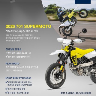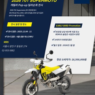2026 701 Supermoto의 공식 런칭에 앞서, 12월 4일부터 11일까지 허스크바나 공식 딜러 MRS에서 전시가 진행됩니다. 현장에서 실물 확인은 물론 701 Supermoto 사전예약을 위한 얼리버드 혜택도 함께 만나보실 수 있습니다. *다른 지역 딜러 전시 또한 순차적으로 공개될 예정입니다. Coming Soon! ? 2026 701 …