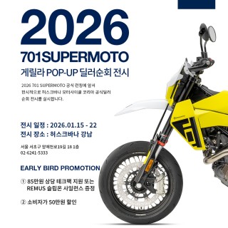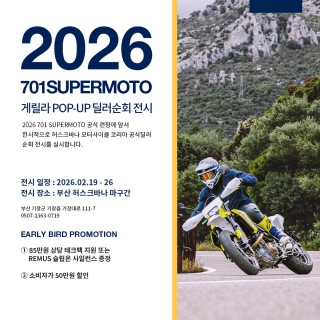 [2026 701 SUPERMOTO 딜러 순회 전시 안내] 허스크바나 공식 딜러 허스크바나 강에서 1월 15일부터 22일까지 26년식 701 SUPERMOTO를 전시합니다. 현장에서 실물 확인은 물론 701 Supermoto 사전예약을 위한 얼리버드 혜택도 함께 만나보실 수 있습니다. ? 2026 701 SUPERMOTO 사전예약 혜택 …