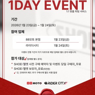 안녕하세요. Shoei Korea입니다! 2개의 업체점(라이더시티, 88모토)에서 1월 23일(금) ~1월 24일(토) P.F.S. 1DAY EVENT를 진행합니다. . ✔️이벤트 기간 2026년 1월 23일(금) - 1월 24일(토) . ✔️이벤트 참여 업체 ————————— 1차 88모토 본점 1월 23일(금) 오전 11시부터~종료시 …