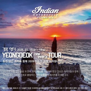 2026년 병오년, 첫 인텐시브 투어를 영덕에서 시작합니다. 힘찬 출발과 안라, 무복, 행라를 기원하며 인디언의 우렁찬 엔진 소리를 신호로 영덕, 울진, 영양 지역을 집중 투어 합니다. 새롭게 포맷한 투어 프로그램으로 출발하는 2026년의 첫 번째 인디언 모터사이클 평택의 인텐시브 투어에 여러분을 초대합니다. ?일정: 2026. 01. 16(금…