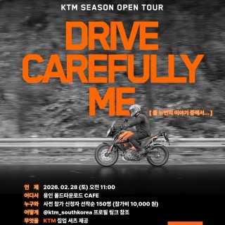 가장 뜨겁게, 가장 안전하게. 여러분만 기다렸습니다. KTM 2026 시즌 오픈 투어 DRIVE CAREFULLY ME(조심히 운전하세요) 2월 28일(토) 용인 올드타운로드 카페에서 2026 시즌의 시작을 함께합니다. ✔ 2026 신모델 전시 (390 ADVENTURE R / ENDURO R / SMC R / DUKE) ✔ GASGAS …