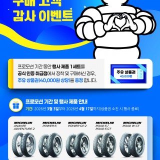 모터사이클 라이더들의 본격적인 시즌 오픈을 앞두고 타이어 교체 비용에 대한 부담을 덜어줄 반가운 프로모션이 열린다. 미쉐린 모터사이클 타이어의 국내 공식 총판인 ‘센스라인’은 고객들의 지속적인 성원에 보답하고 안전한 라이딩을 지원하기 위해 봄맞이 ‘미쉐린 모터사이클 타이어 구매 고객 감사 이벤트’를 실시한다고 밝혔다.