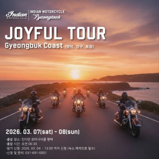 인디언 모터사이클 평택이 고객과 함께 동행하며 진행하는 "조이플 투어" 프로그램. ?2026 조이플 투어 ver,2 3.7(토) ~ 8(일) 아름다운 경북의 해안선을 따라 두번째 이야기를 담으러 출발합니다. 특별히 이번 투어는 경북 해안의 볼거리와 특별한 먹거리가 기다리고 있습니다. ?집결지: 3/7 ✔️인디언 모터사이클 평택 전시장 …